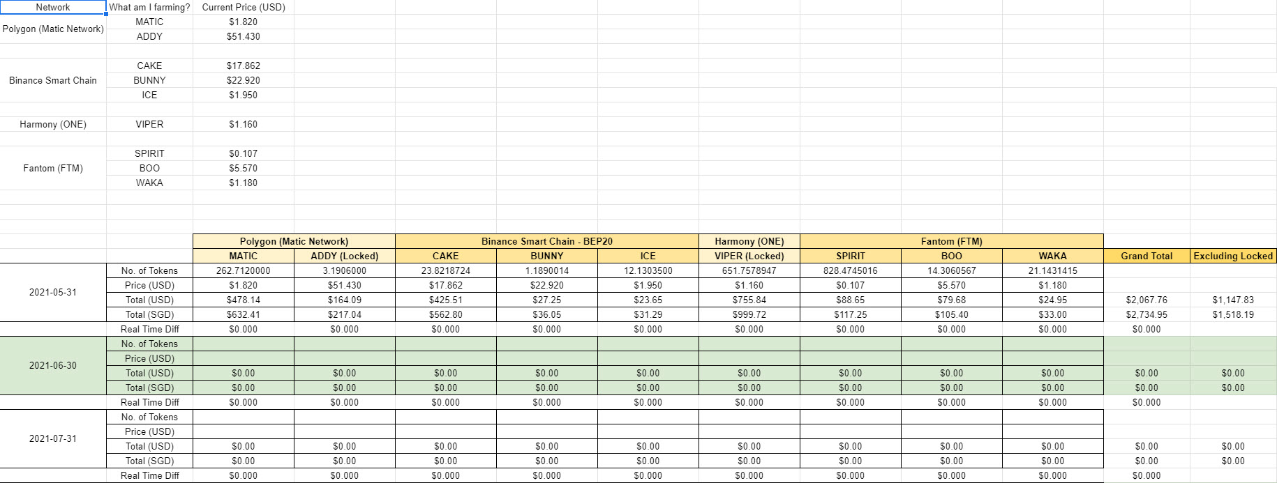 Tracking crypto investment becomes very painful when the number of coins increases as well as when I move across to different networks. Hence, to simplify the tracking, I will just be tracking the capital I put in vs the current value at the end of the month.